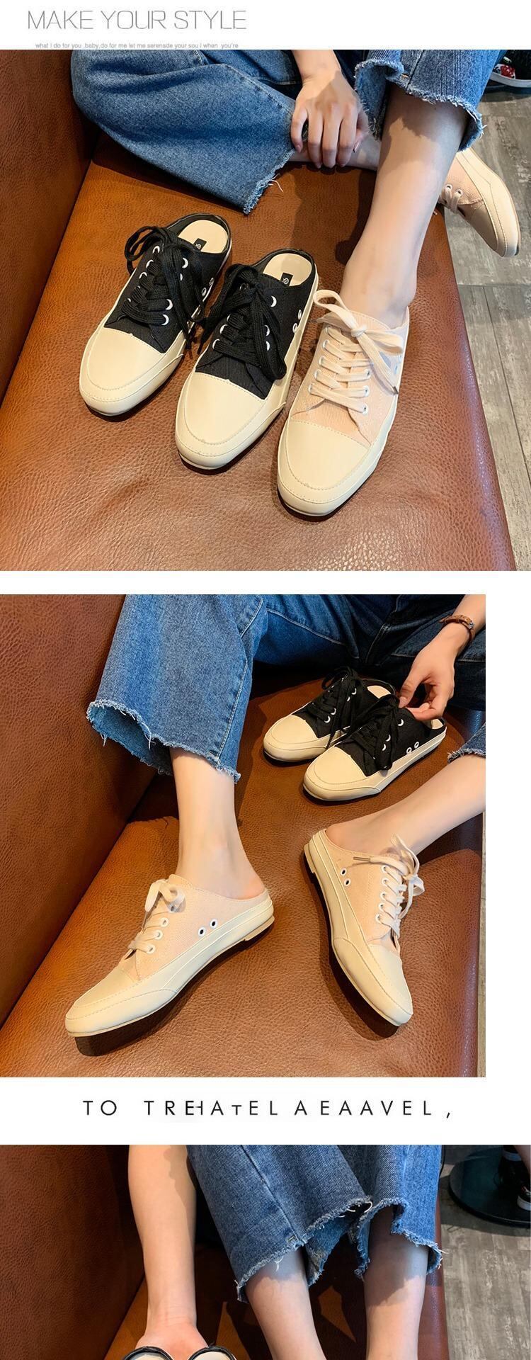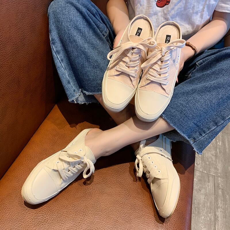 ノーヒールレイジーシューズレディース2019夏新作スクエアヘッドワイルドネットレッドキャンバスシューズハーフドラッグファッションウェア 部族の婦人靴3790198