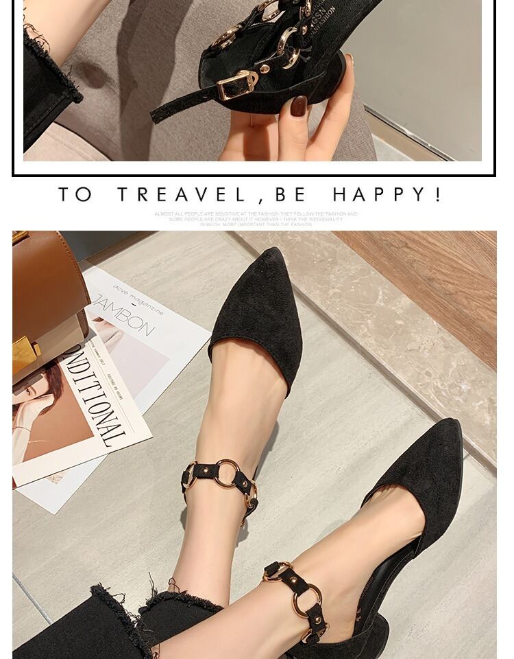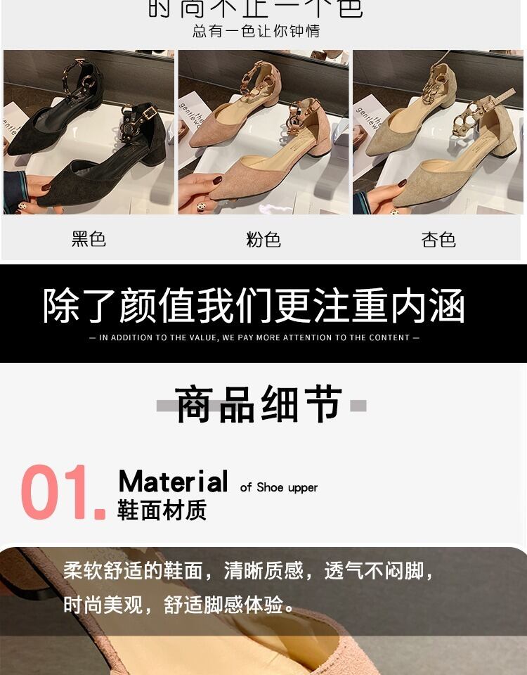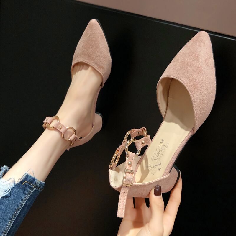 ヒールの女性2020春の新しいワンラインバックル浅い口の尖ったサンダル厚いヒールの妖精スタイルのシックな靴 部族の婦人靴6644797
