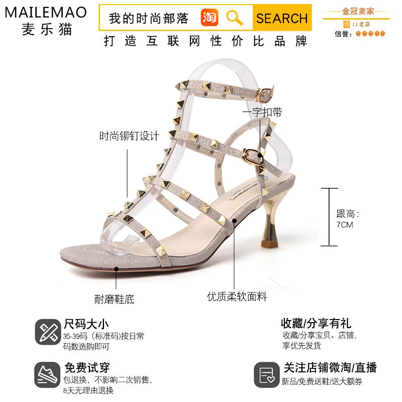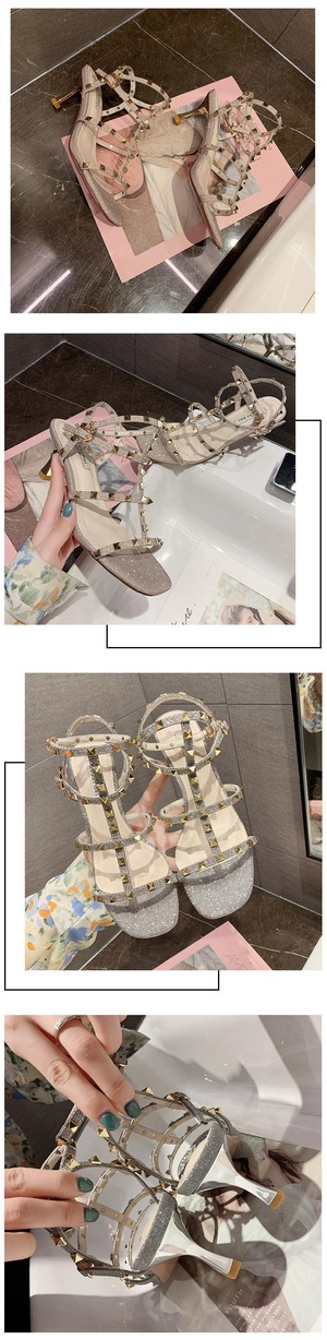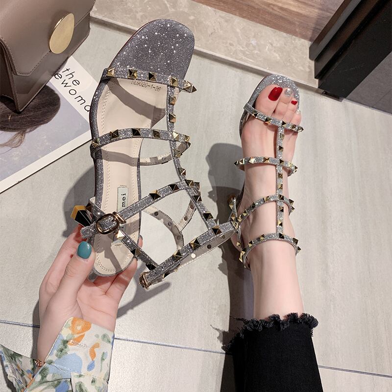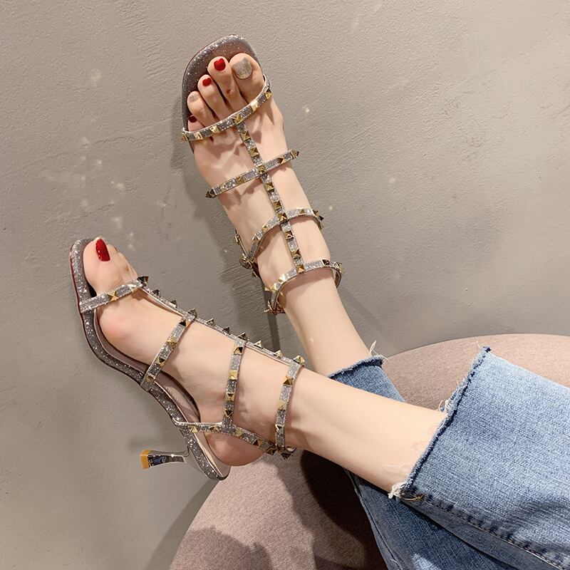サンダル女性の妖精スタイル2020新しい春と夏のファッション野生のオープントゥリベット細かいヒールTストラップハイヒール 部族の婦人靴8046641