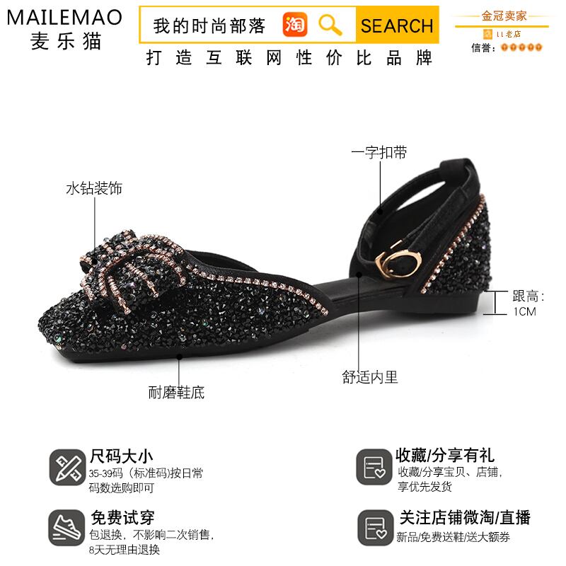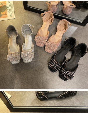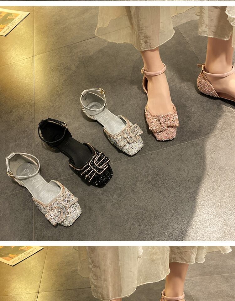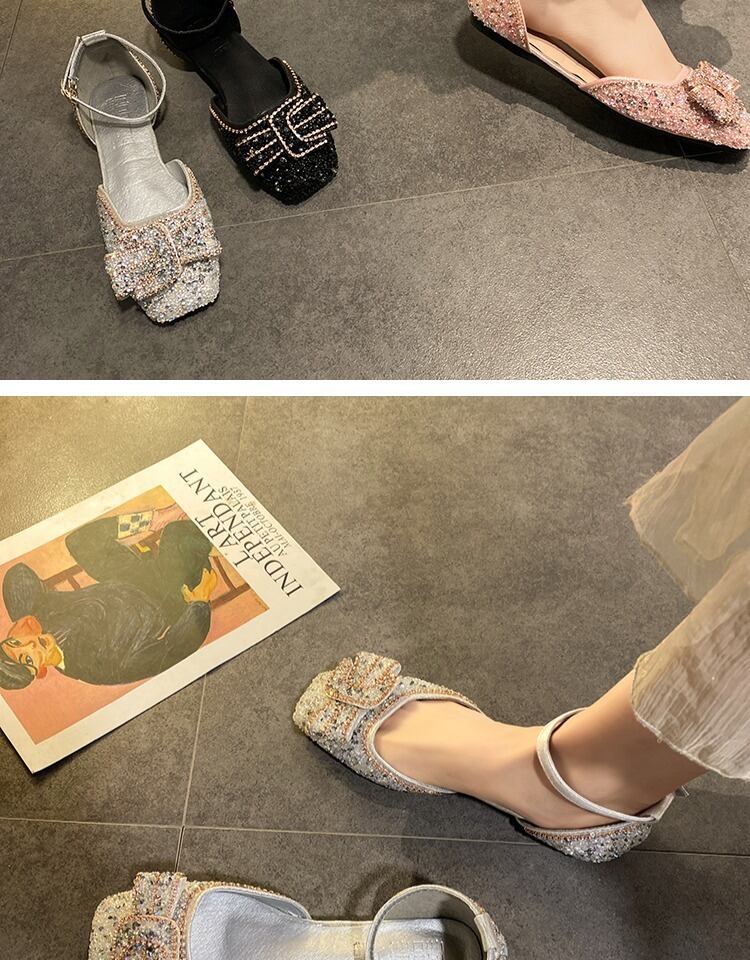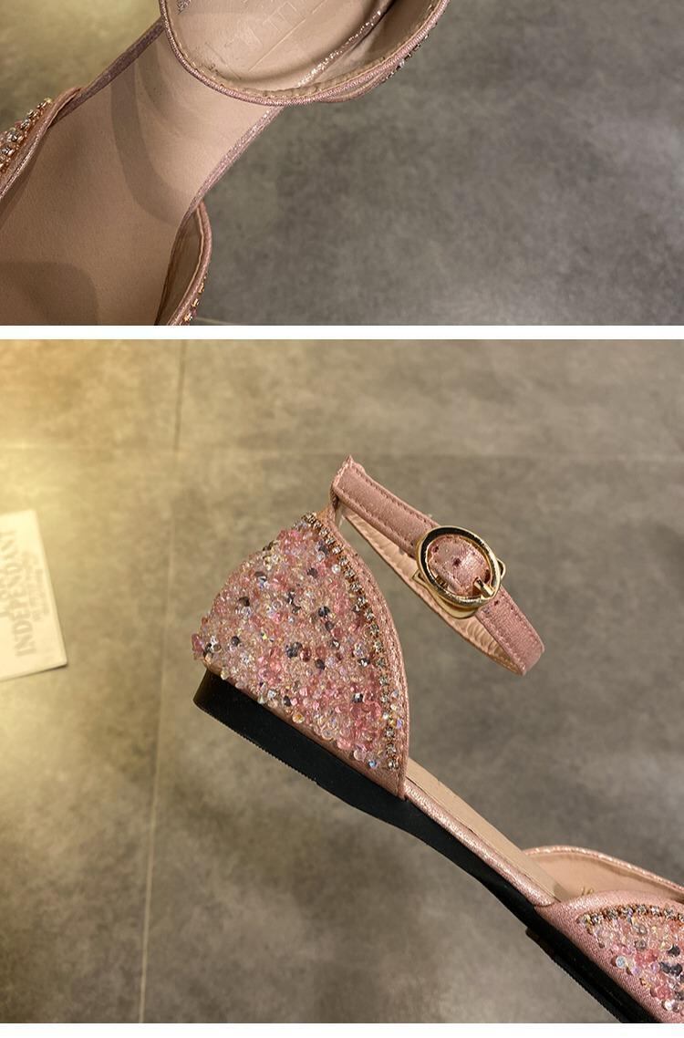 サンダルレディースフラットシューズ2020レディースラインストーンフラットボトムノンスリップファッションワイルドホウトウフレンチワードバックルシングルシューズ 部族の婦人靴2648208