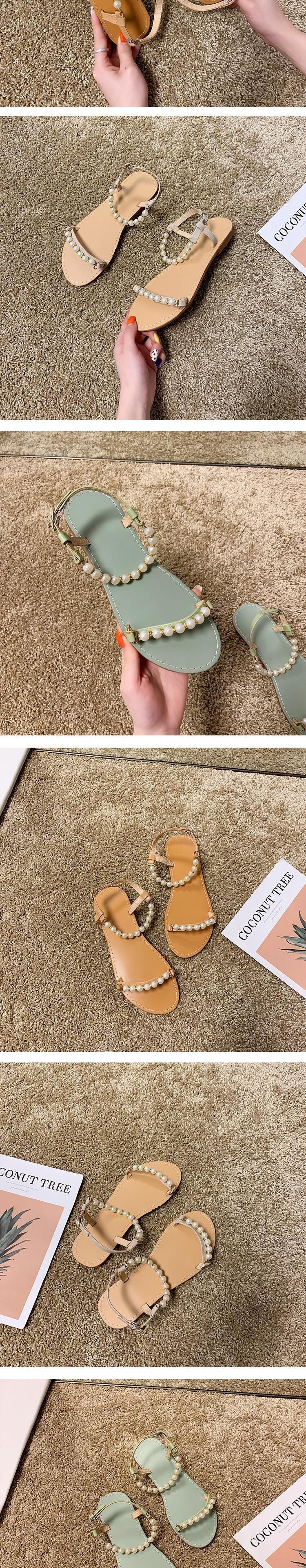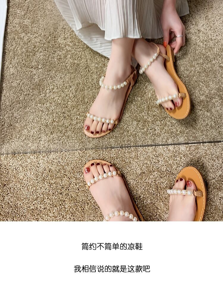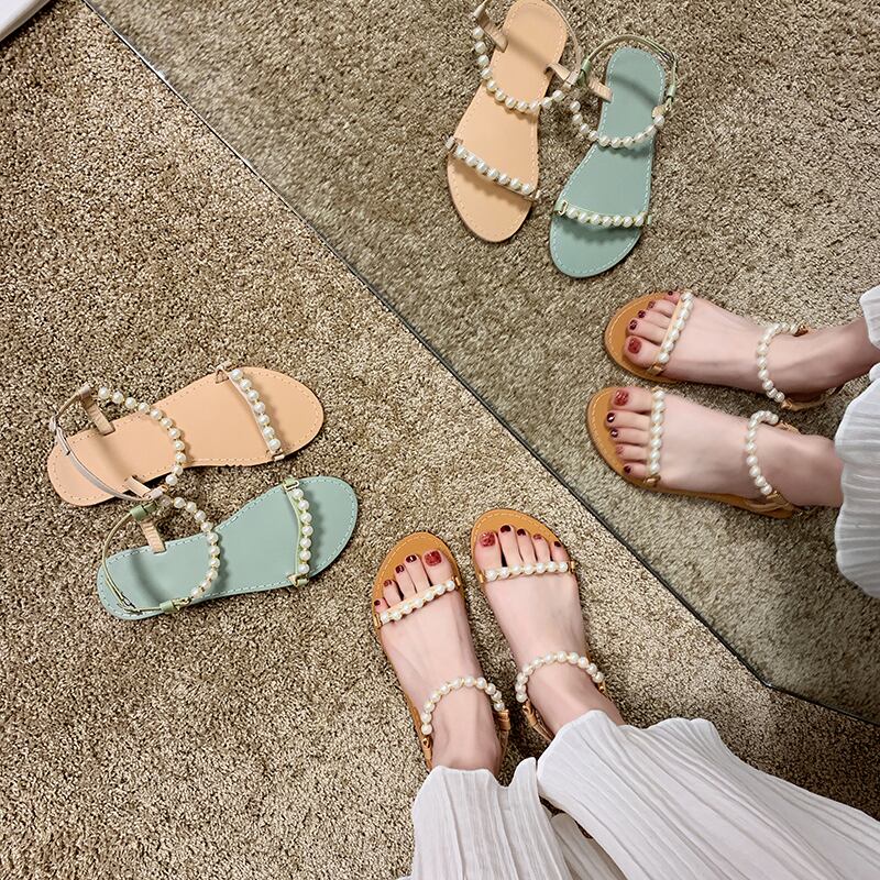 真っ赤なサンダル女性のフラットシューズ2020春バージョンのパールワイルドオープントゥノンスリップファッションインタイドローマンシューズ 部族の婦人靴7831336
