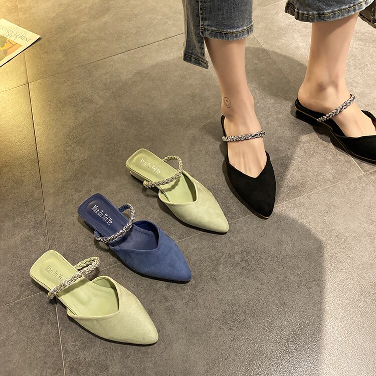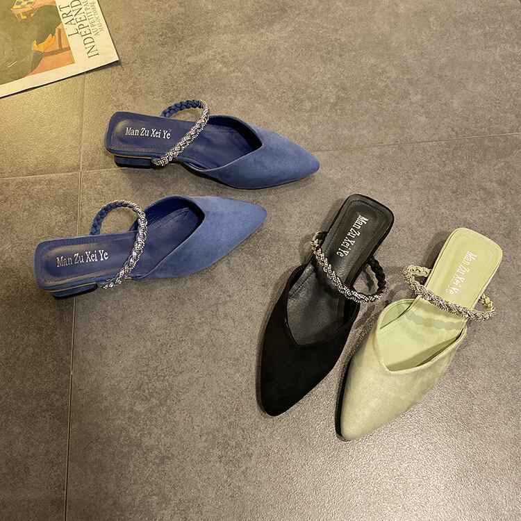 厚いヒールの靴女性2020年春新しいファッション野生ネットワーク赤外線摩耗ins潮ラインストーンポインテッドハーフスリッパ 部族の婦人靴8680238