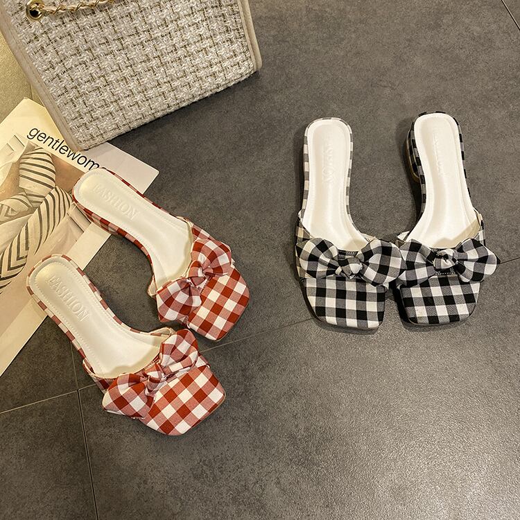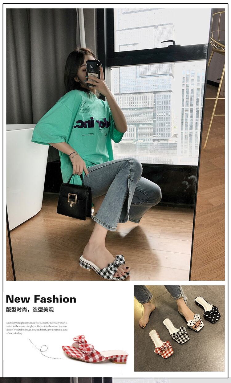 スリッパ女性は2020新しい女性の夏のファッション格子波ドット弓厚いヒールノンスリップミュール靴潮を着用します。 部族の婦人靴4522912