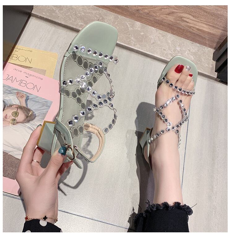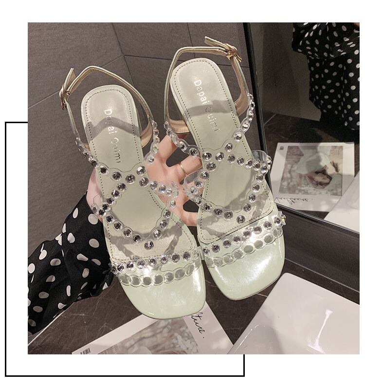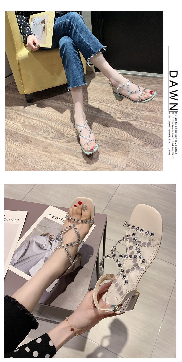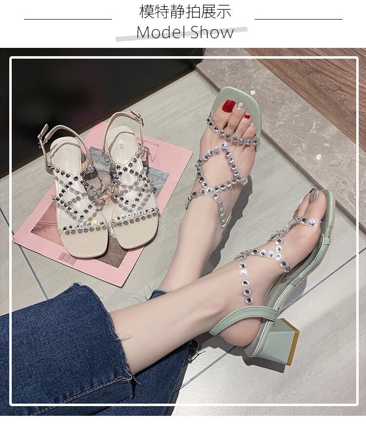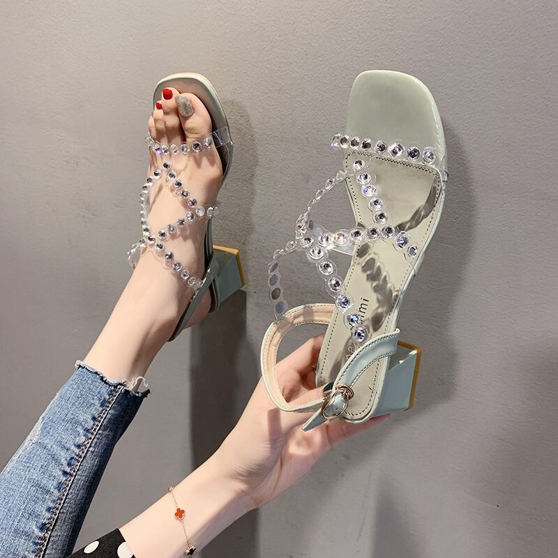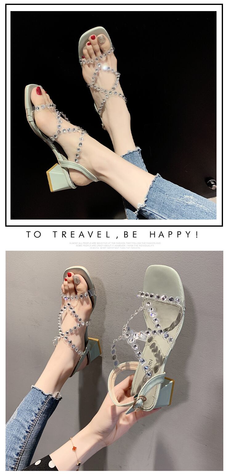 サンダル女性の妖精風2020夏の新しいファッションラインストーンスクエアヘッドワイルドワードバックルハイヒール女性 部族の婦人靴1652554