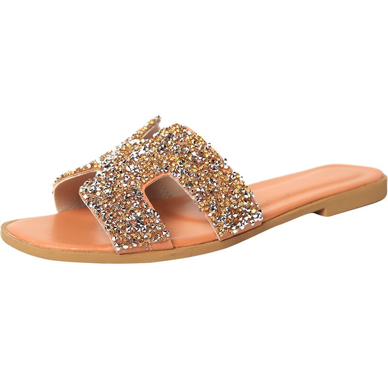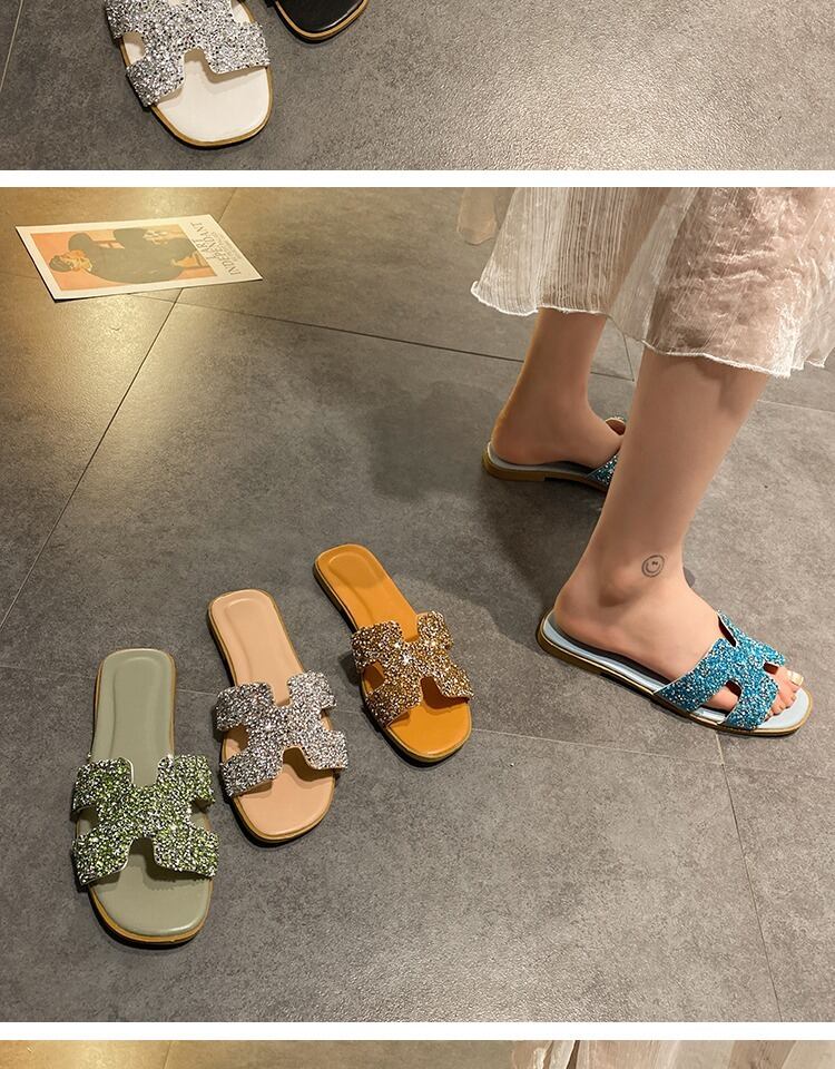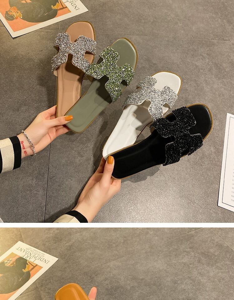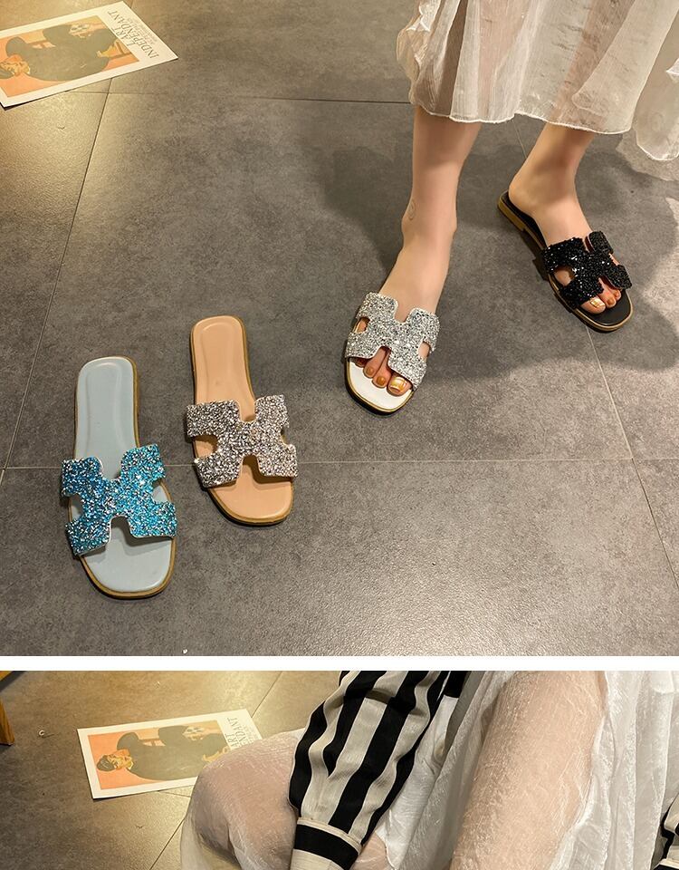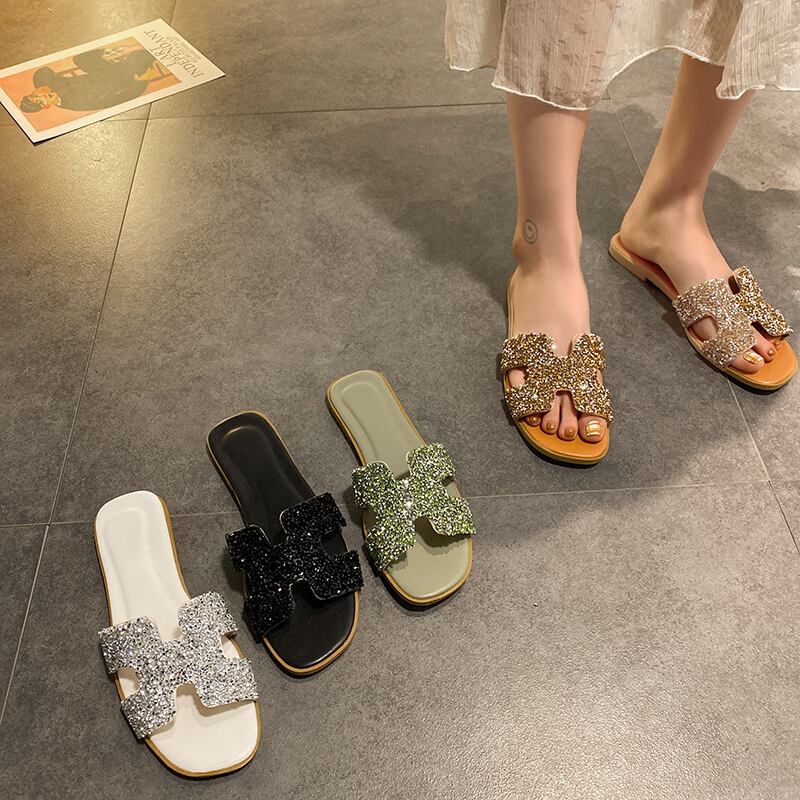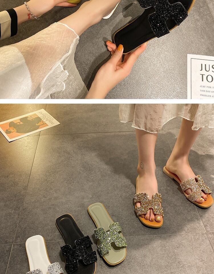 野生のネット赤いスリッパの女性の2020年夏の新しい学生フラットボトム女性のドラッグソフトボトム明るいダイヤモンドの女性の単語のドラッグ潮を着用してください 部族の婦人靴4293062