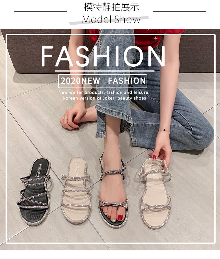 1つの単語ネット赤女性スリッパ夏2020新しい摩耗野生のファッションラインストーンカジュアルフラットビーチサンダル女性 部族の婦人靴4084268