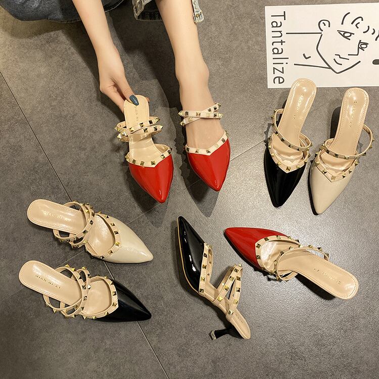 セミスリッパレディース2020新作厚ヒール尖ったリベットファインヒールミュラーシューズフェアリースタイルホウトウファッションハイヒール 部族の婦人靴6694208