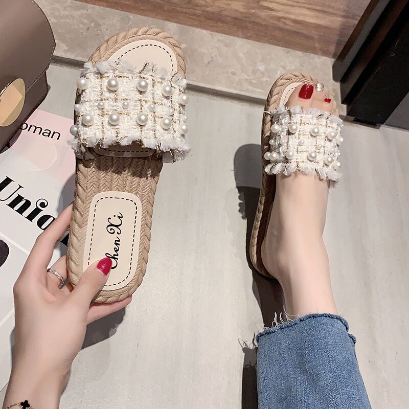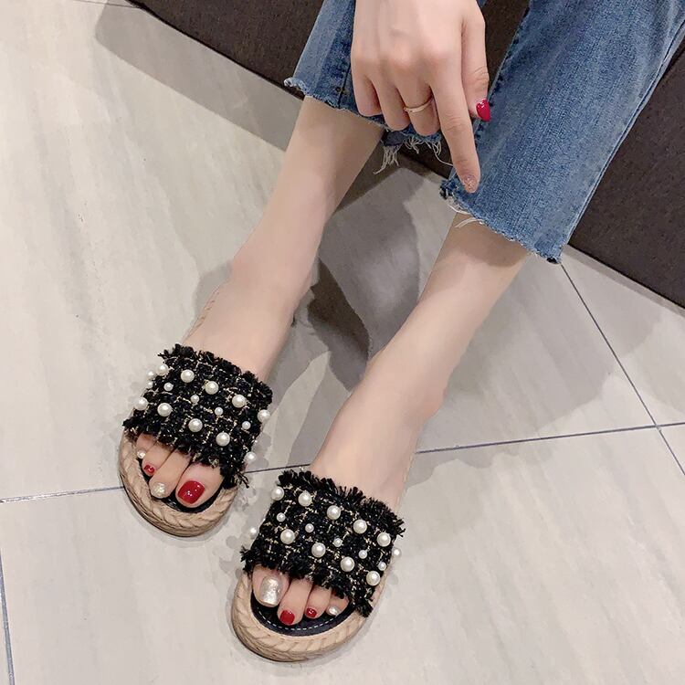 サンダルとスリッパレディースアウターファッション2020年新作夏パール小さな香り風ワンワードドラッグソフトボトムドラッグ女性潮 部族の婦人靴0624751