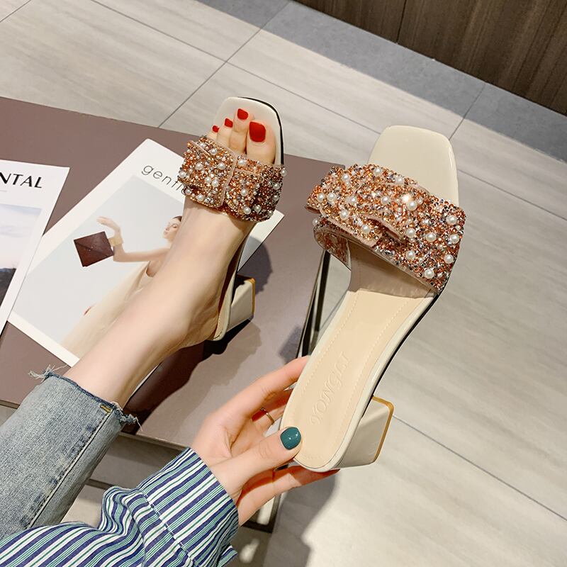 スリッパ女性は2020年の新しい夏の女性の靴ファッション野生の真珠のハイヒール厚いヒールオープンつま先サンダルを着用します。 部族の婦人靴8024146