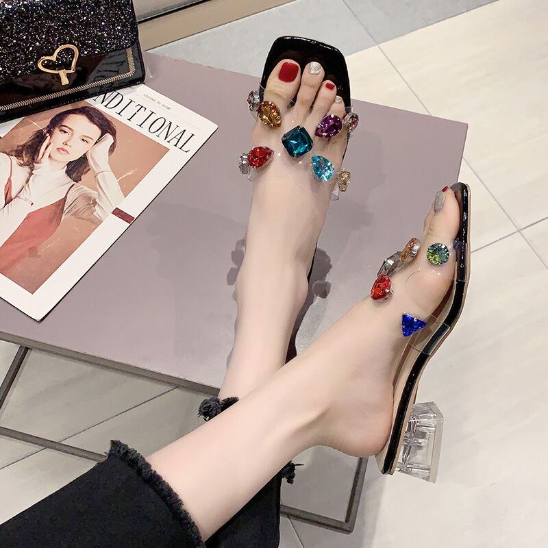 スリッパ女性は2020夏の新しいファッションラインストーンワイルドネット赤い透明なオープントゥの厚さで単語のサンダルの潮を着用します 部族の婦人靴3440482