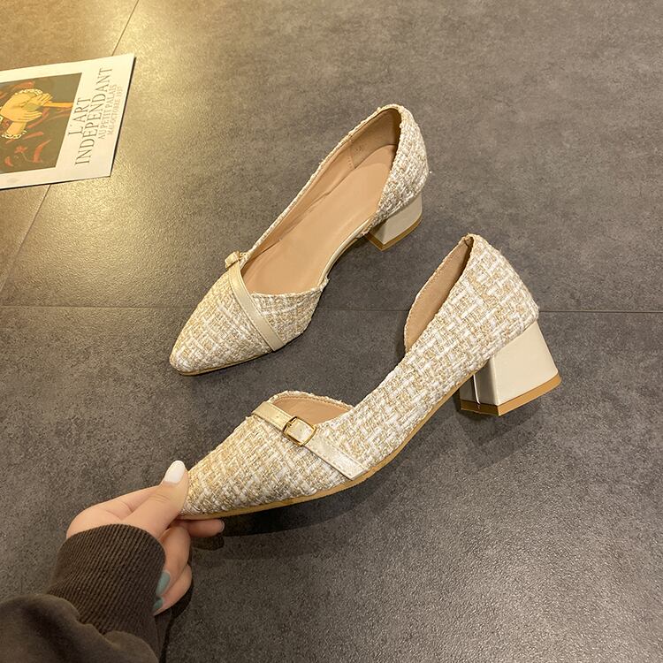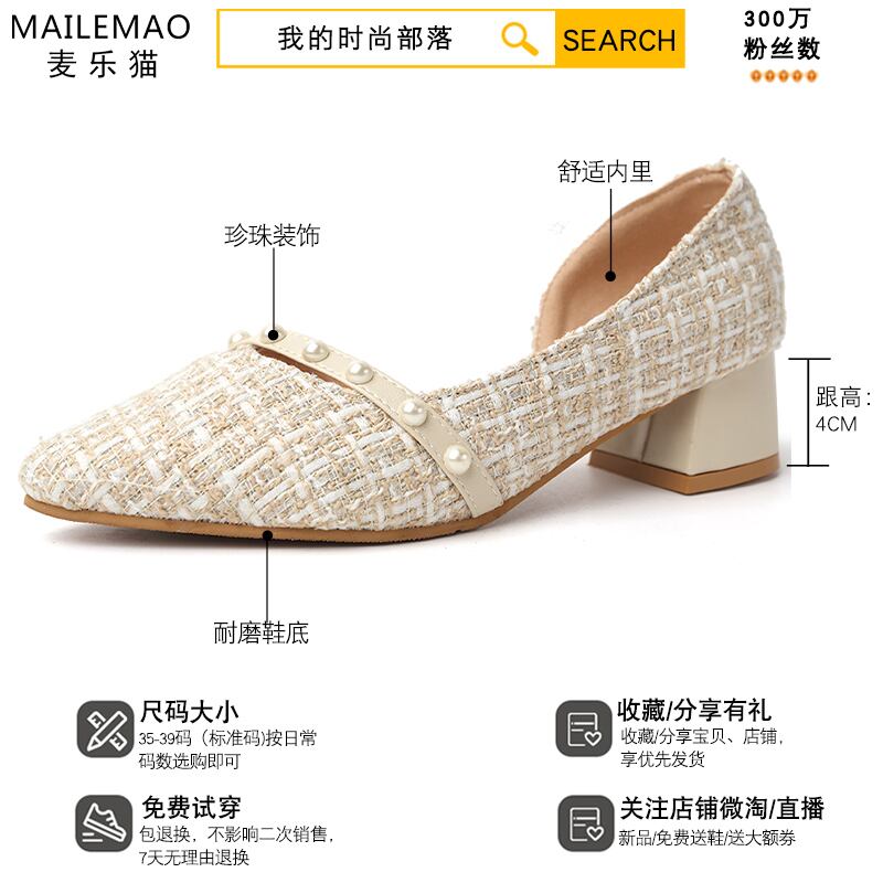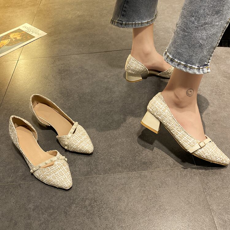 靴女性2020新しい夏のファッション真珠指摘ネット赤い女性の靴浅い口厚いヒールイブニングシューズスクープシューズ 部族の婦人靴4246058