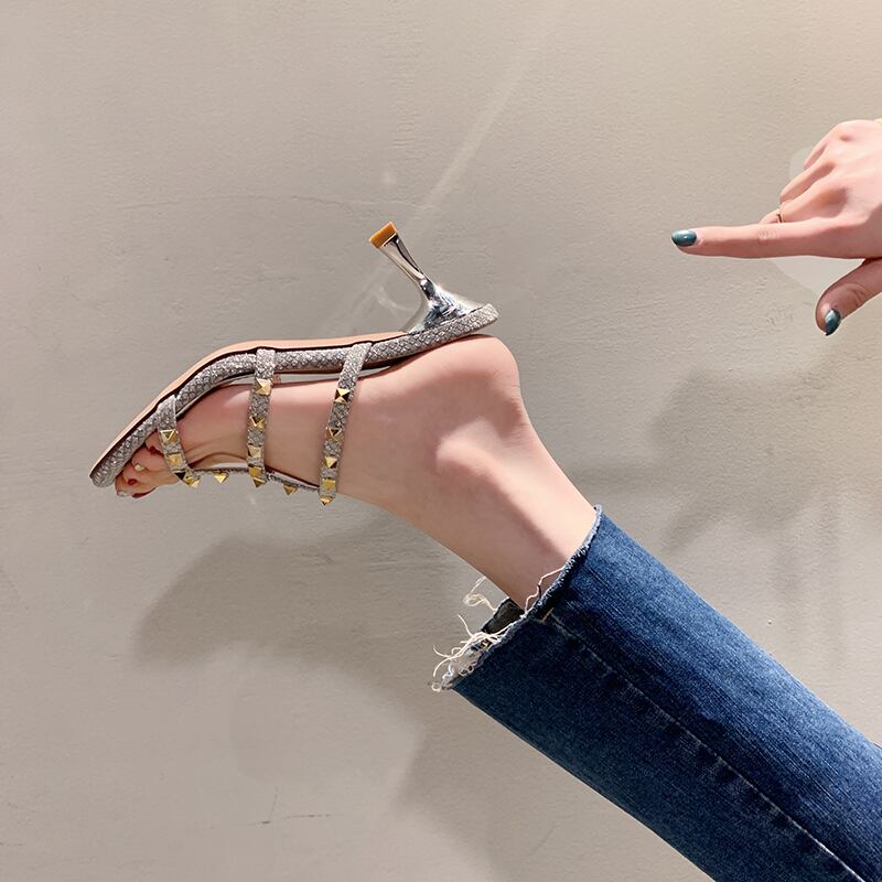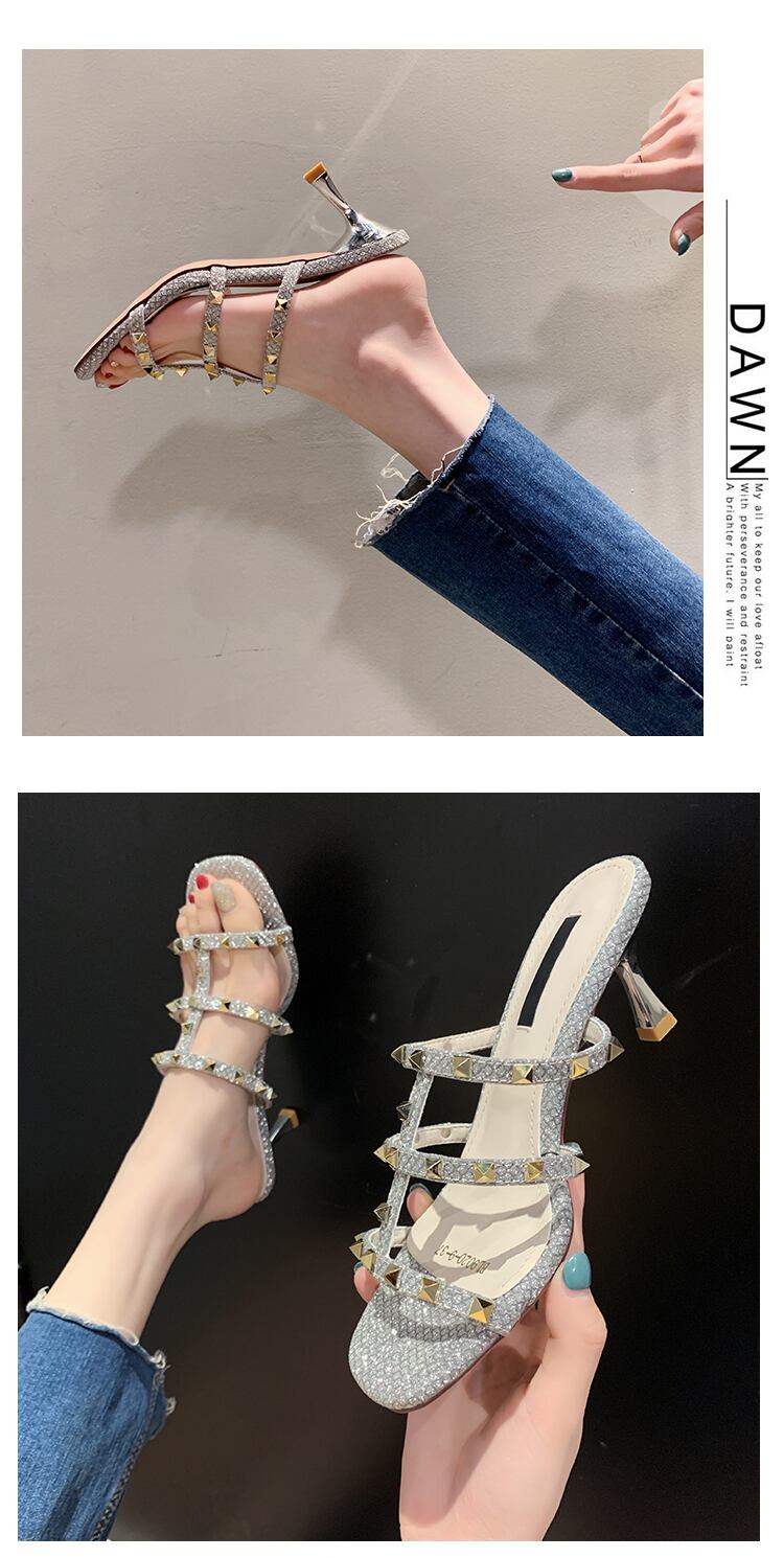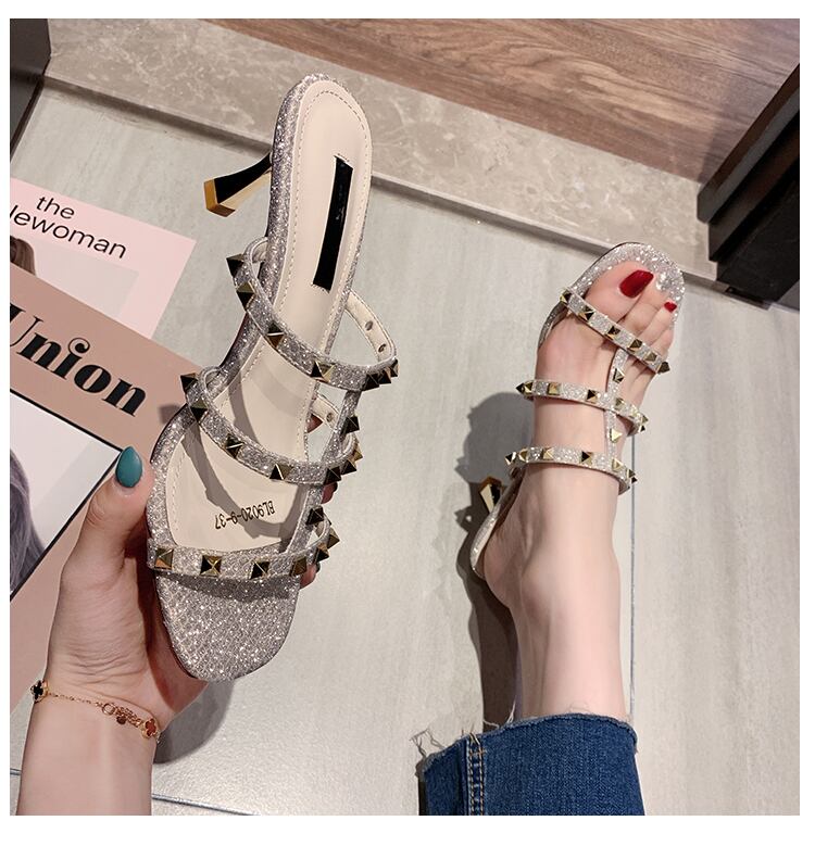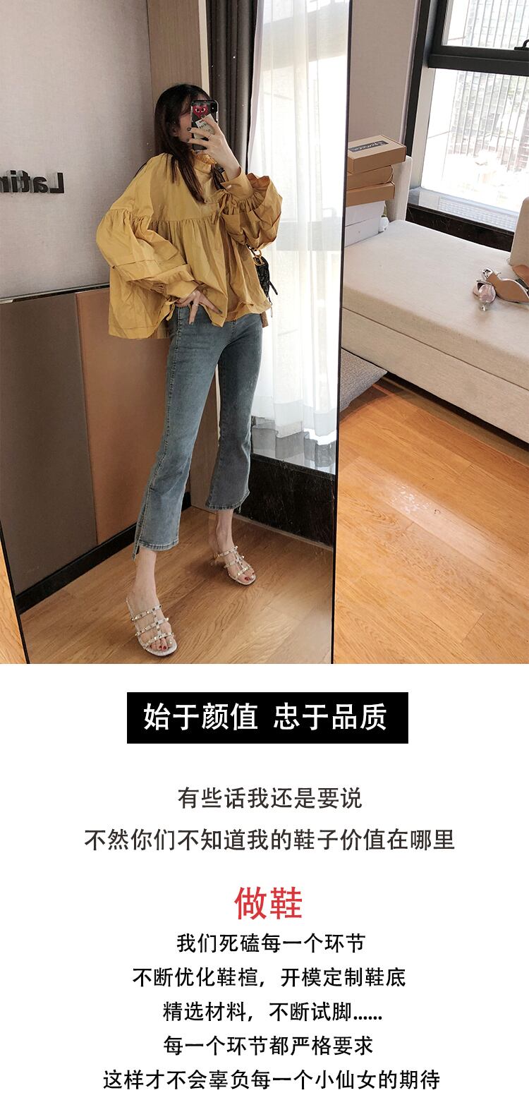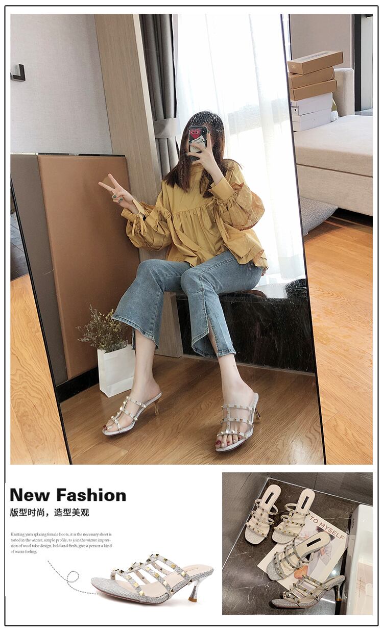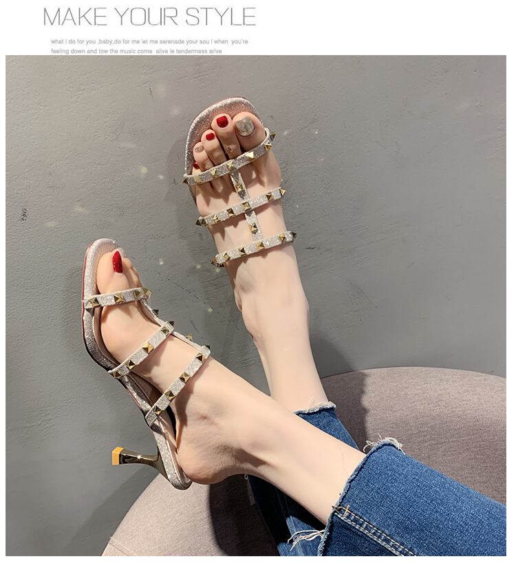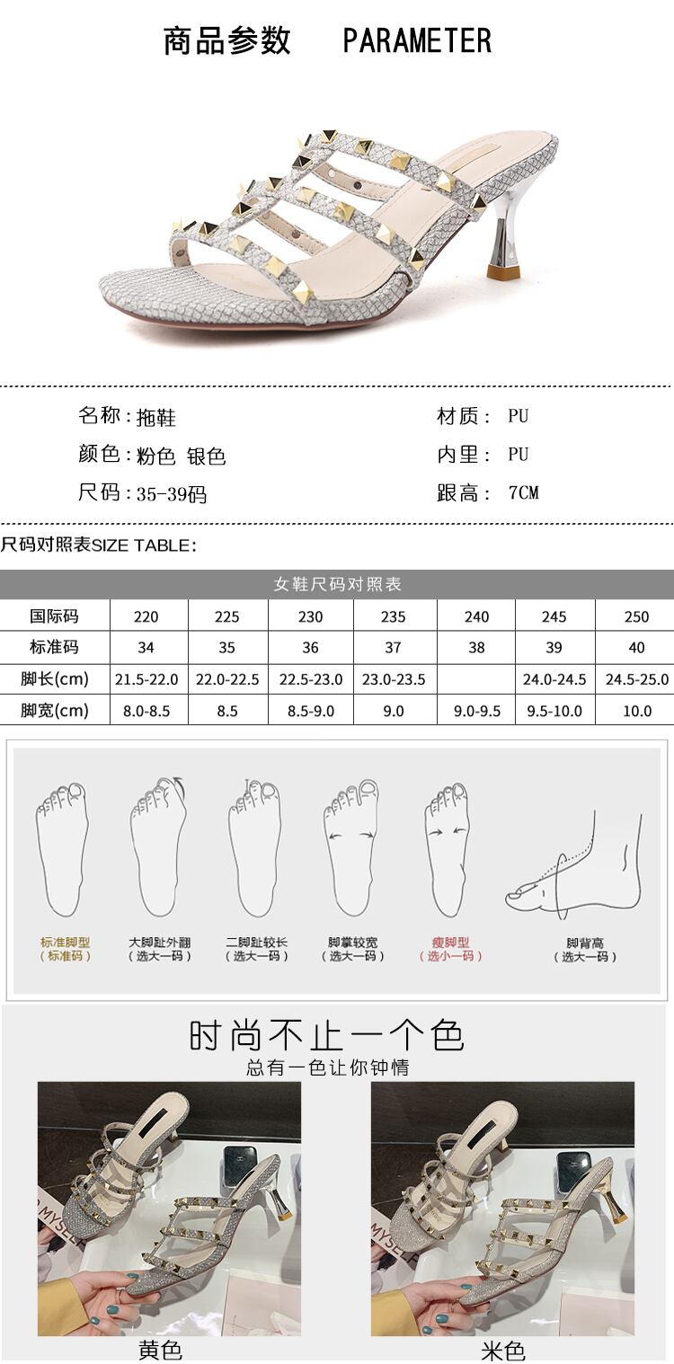 スリッパの女性は、2020年夏のリベットハイヒールのスクエアヘッドワイルドネットレッドの新しいinsタイドバージョンを着用しています 部族の婦人靴3910682