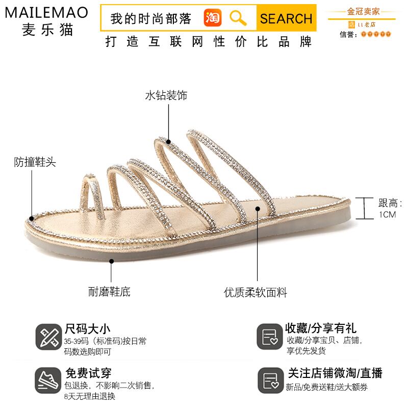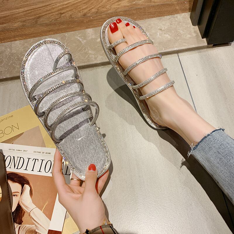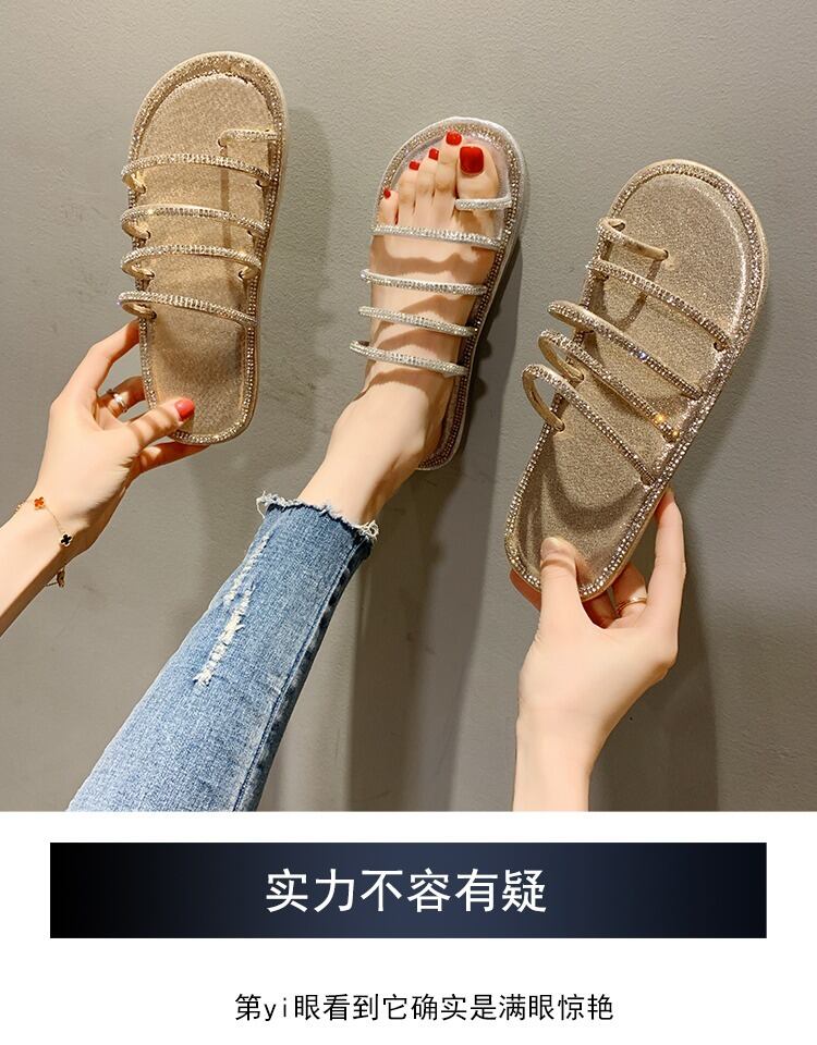 スリッパ女性2020年夏新しい香港スタイル外摩耗純赤いファッションラインストーンワードドラッグワイルドフラットノンスリップサンダル 部族の婦人靴7033649