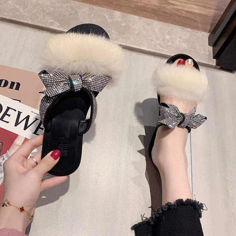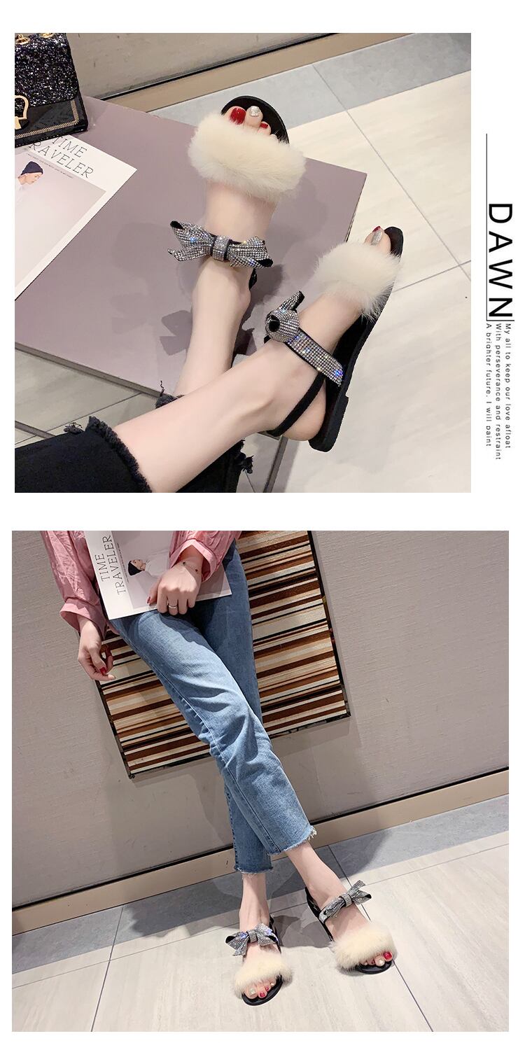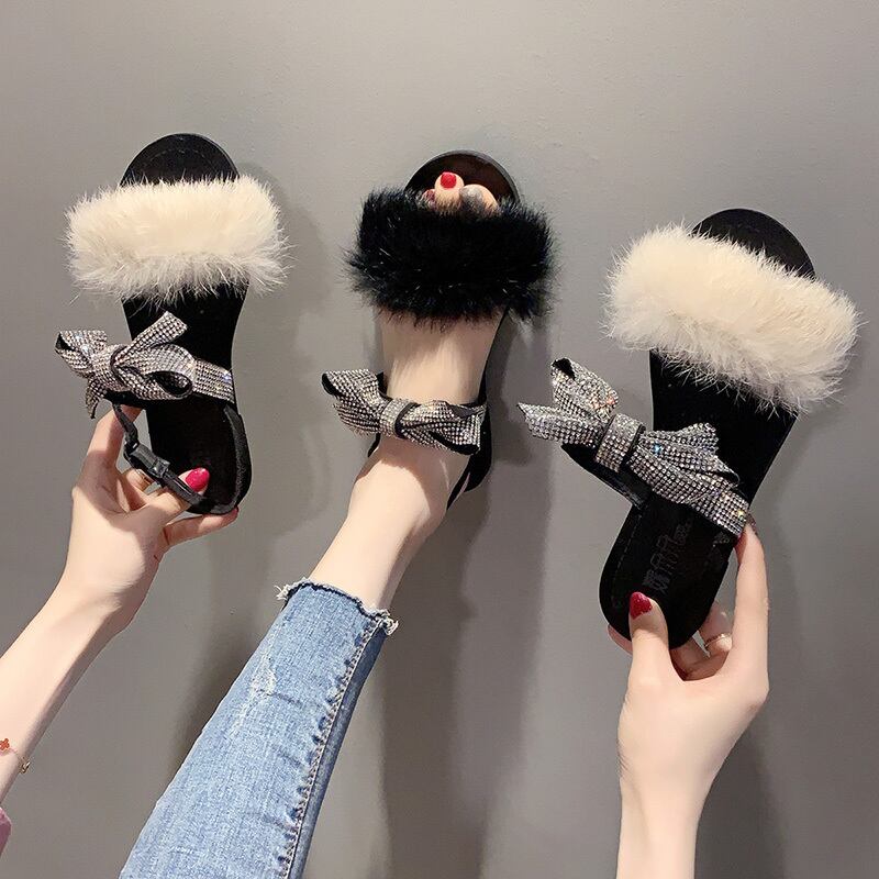 スリッパ女性は2020夏のファッション野生のネット赤インラインストーン弓オープントゥ妖精毛深いサンダルを着用します。 部族の婦人靴9489404