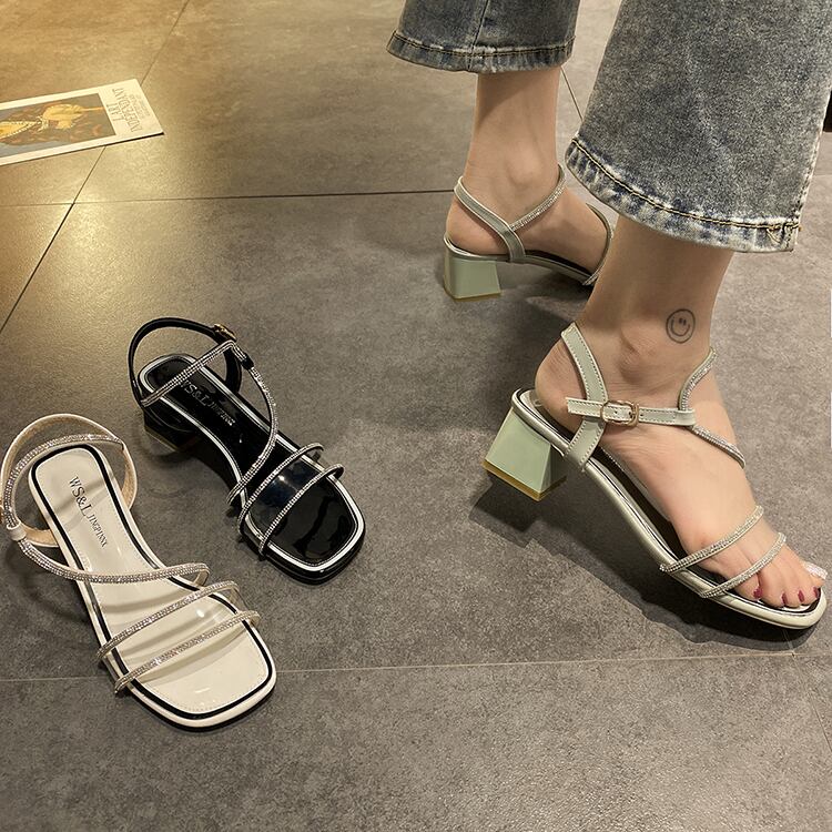 ワイルドネットレッドインラインストーンストラップオープントゥバックル厚ヒールローマンシューズのサンダルレディース2020新バージョン 部族の婦人靴4372966