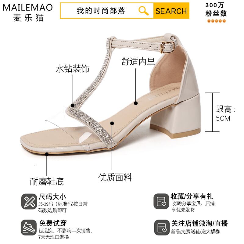 ワンワードベルトサンダルレディース2020新作ファッションスーパーファイヤーシンプル厚手ヒール透明ラインストーンハイヒールトレンド 部族の婦人靴7911046