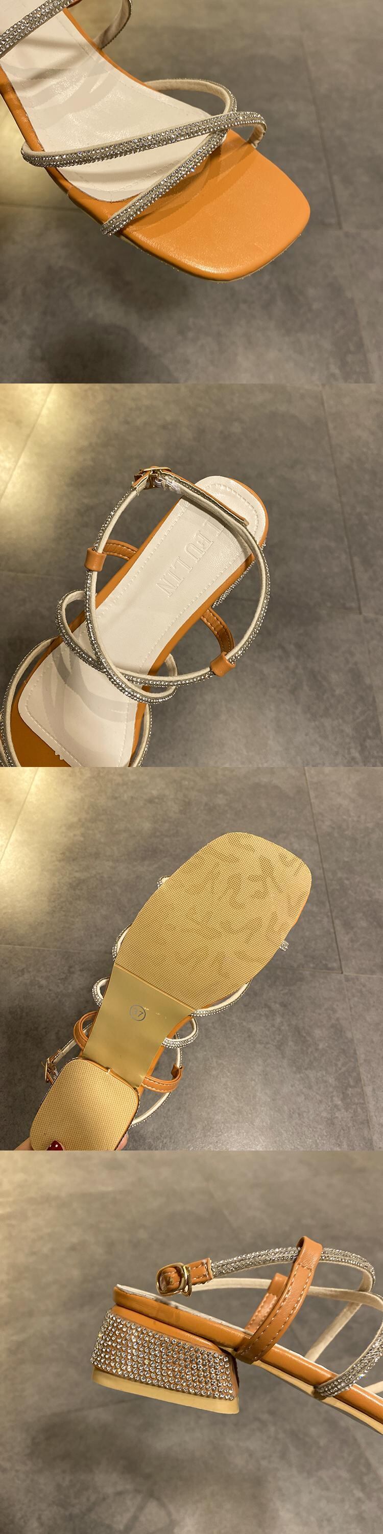 ラインストーンネット赤正方形つま先ファッションオープンつま先セクシーな野生の厚いヒールハイヒールのサンダル女性2020夏新バージョン 部族の婦人靴0063543