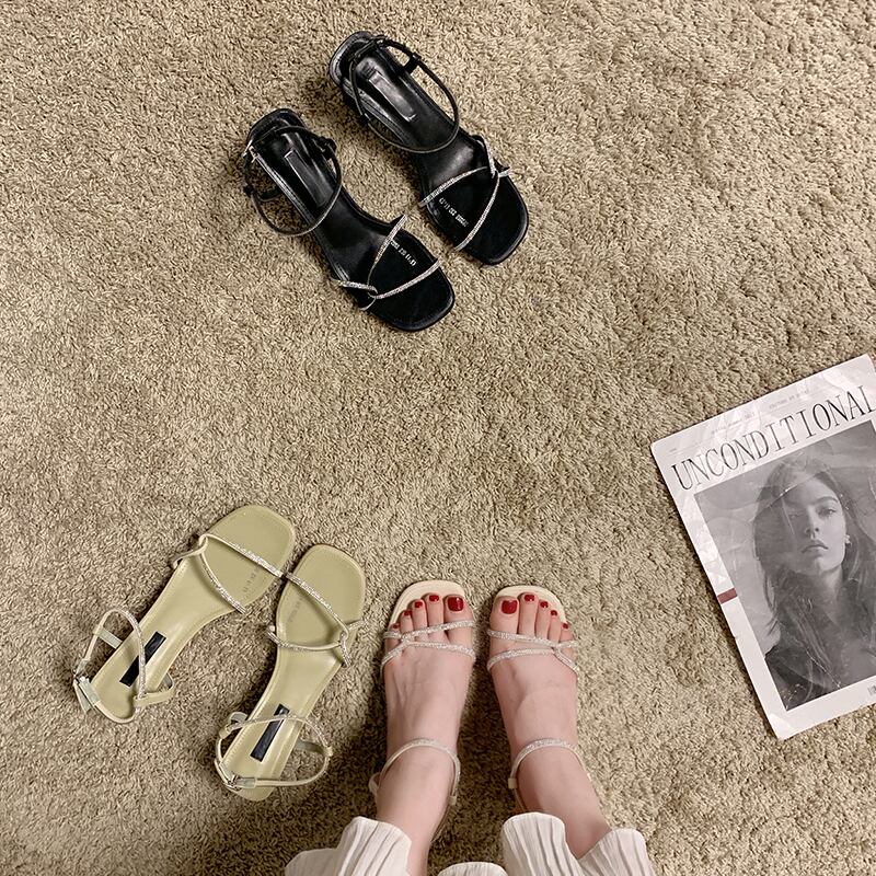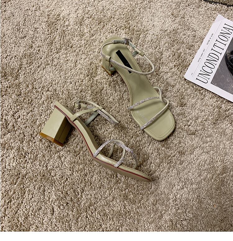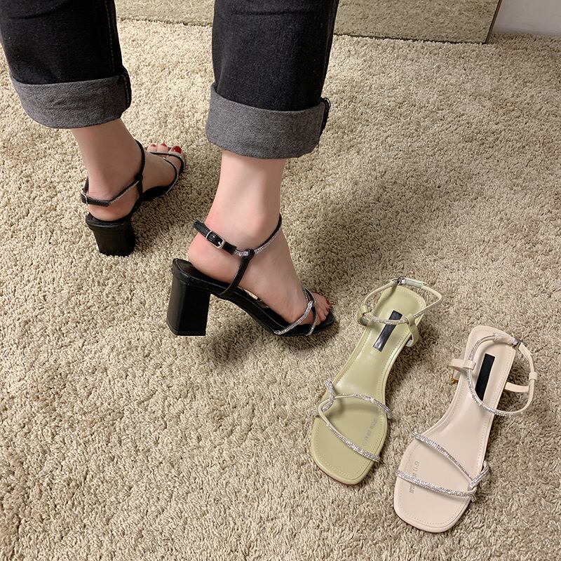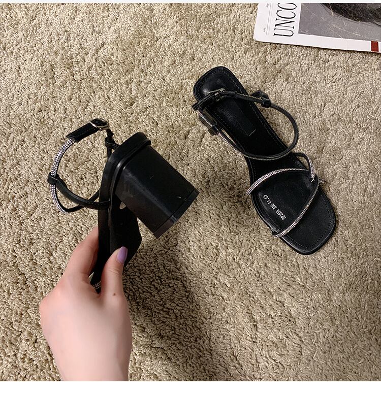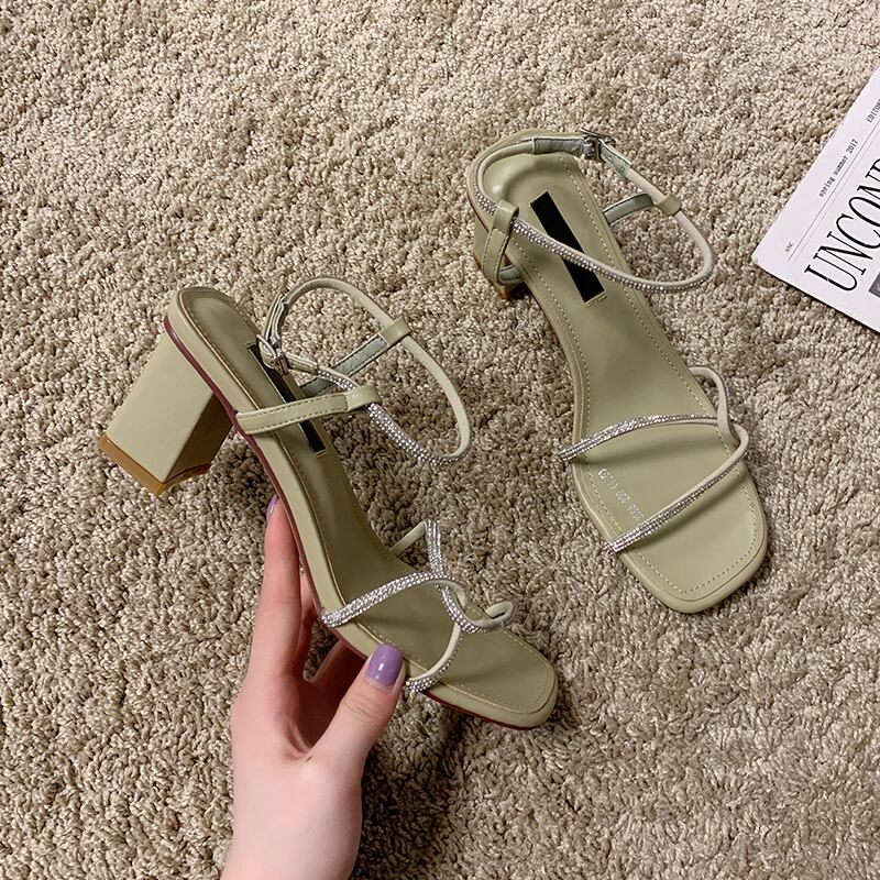 ラインストーンサンダル女性の妖精スタイル2020新しい夏のファッションスクエアヘッドオープンつま先の厚いバックルネットの赤いスーパーウェーブ 部族の婦人靴3595256