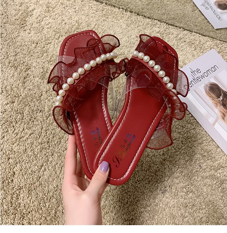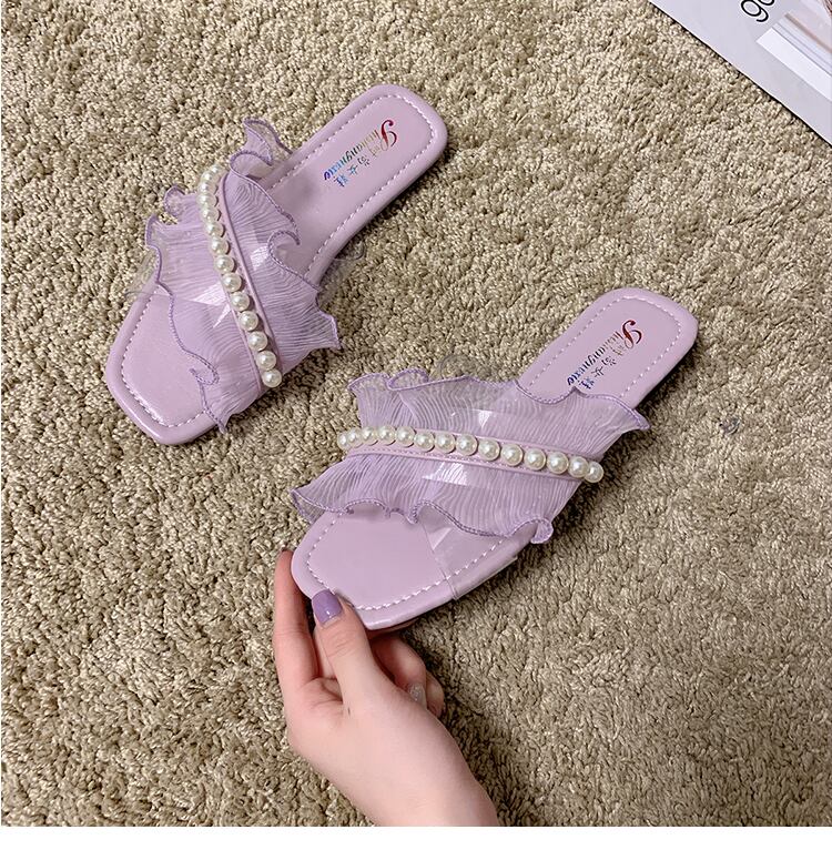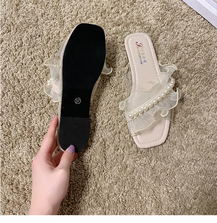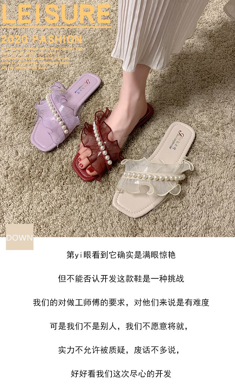 サンダルとスリッパレディースアウターウェア2020新しい夏のスクエアヘッドパールフラットオープントゥカジュアルレースフリップフロップ 部族の婦人靴16227367794