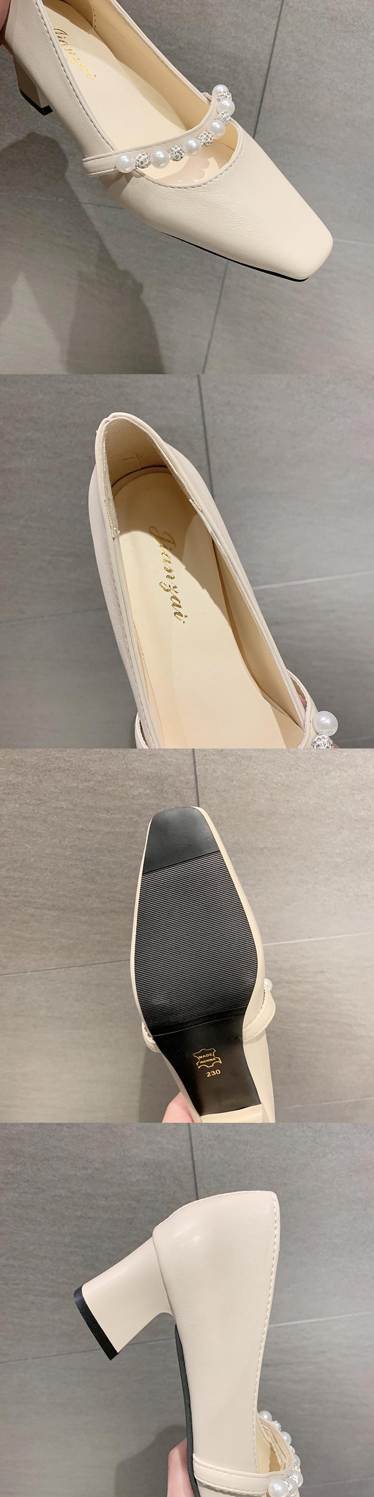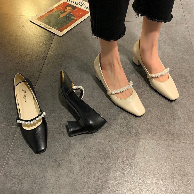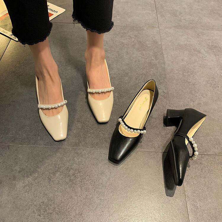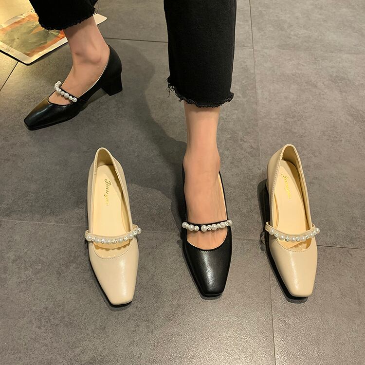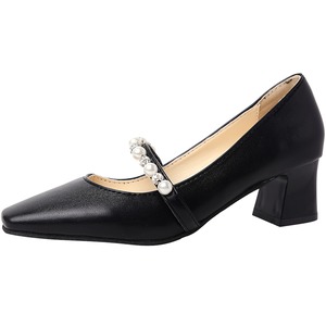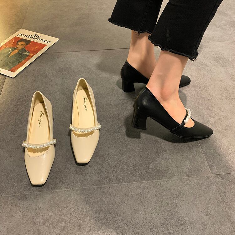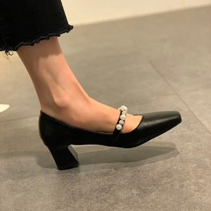 ブラックスプリングヒールパール 靴 シューズ ハイヒール 春物 真珠 スクウェア 部族の婦人靴18594026571