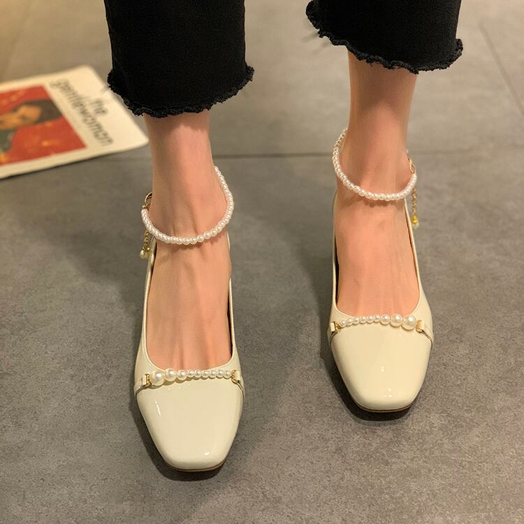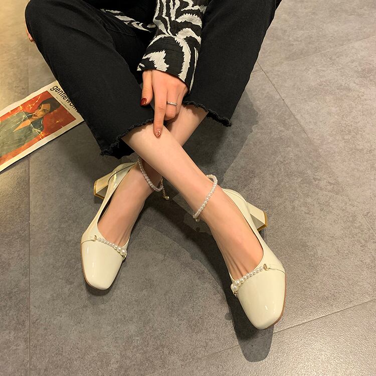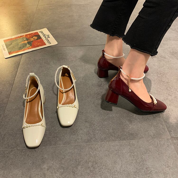 ヒールスプリングレッドスタンダードパールバックル 靴 シューズ レトロ 春物 真珠 スクウェア 部族の婦人靴34908347373