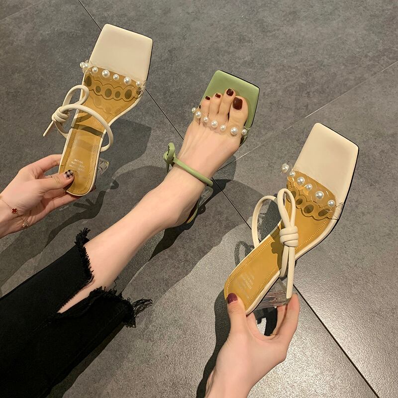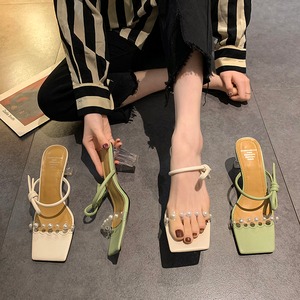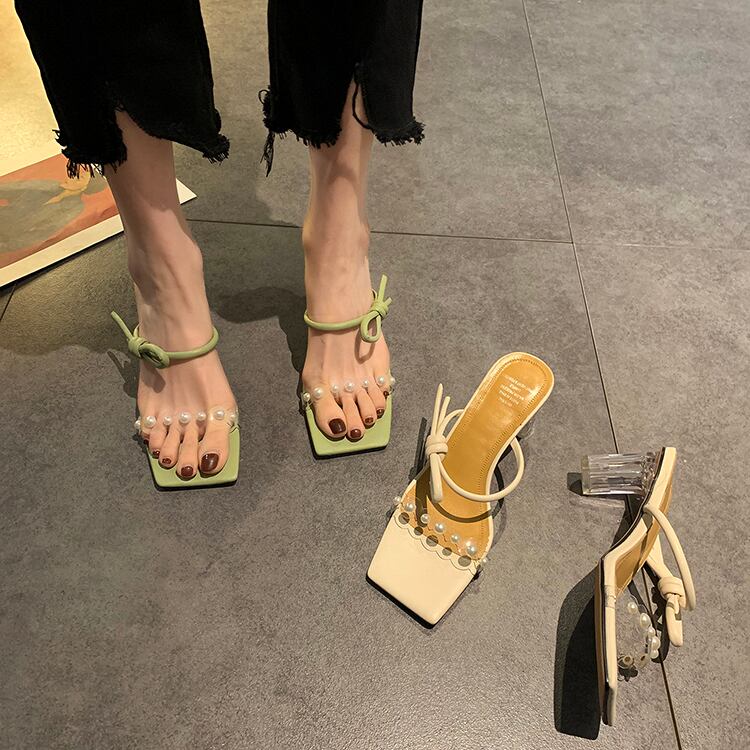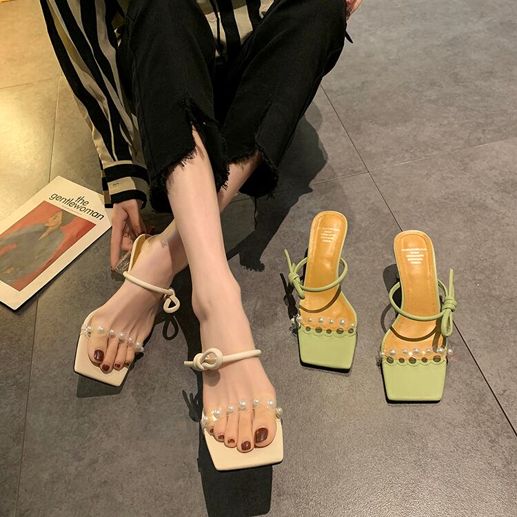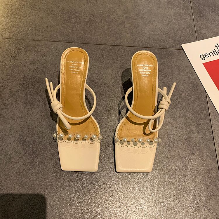 サマーパールカラー ハイヒール 靴 シューズ ミュール 夏物 ピュア 真珠 スクウェア 部族の婦人靴23742429118