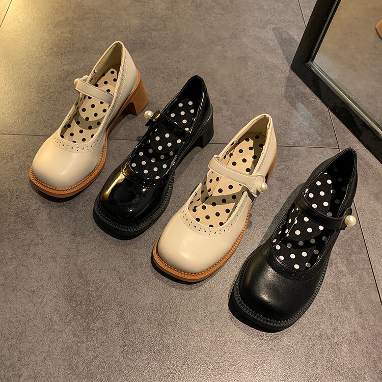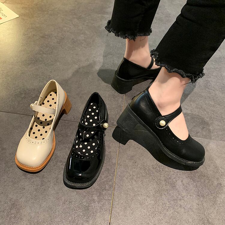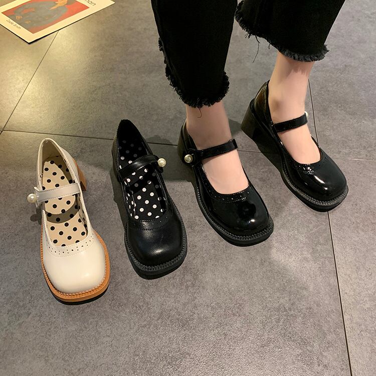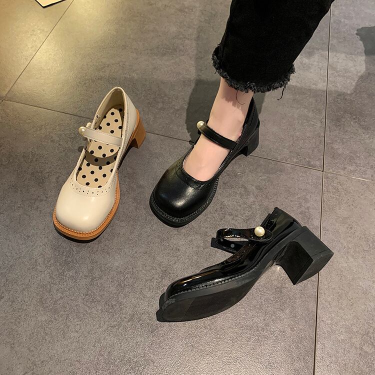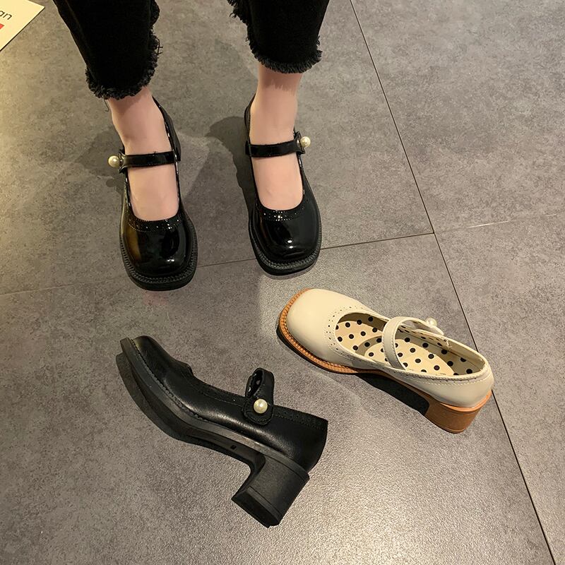 レザーサマースタイルパールバックルブラックハイヒール 靴 シューズ 夏物 真珠 部族の婦人靴4325613063