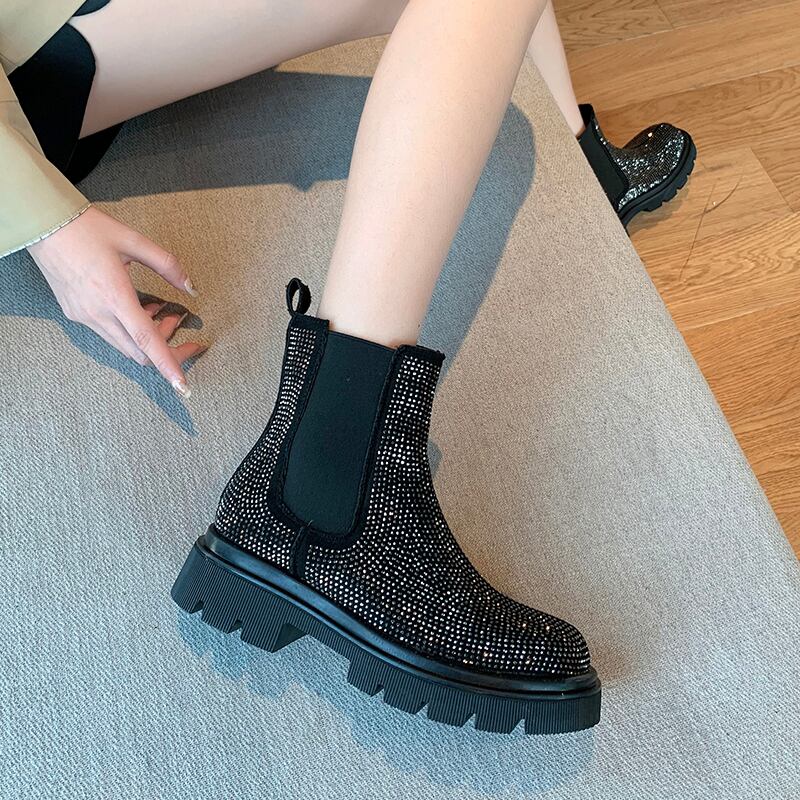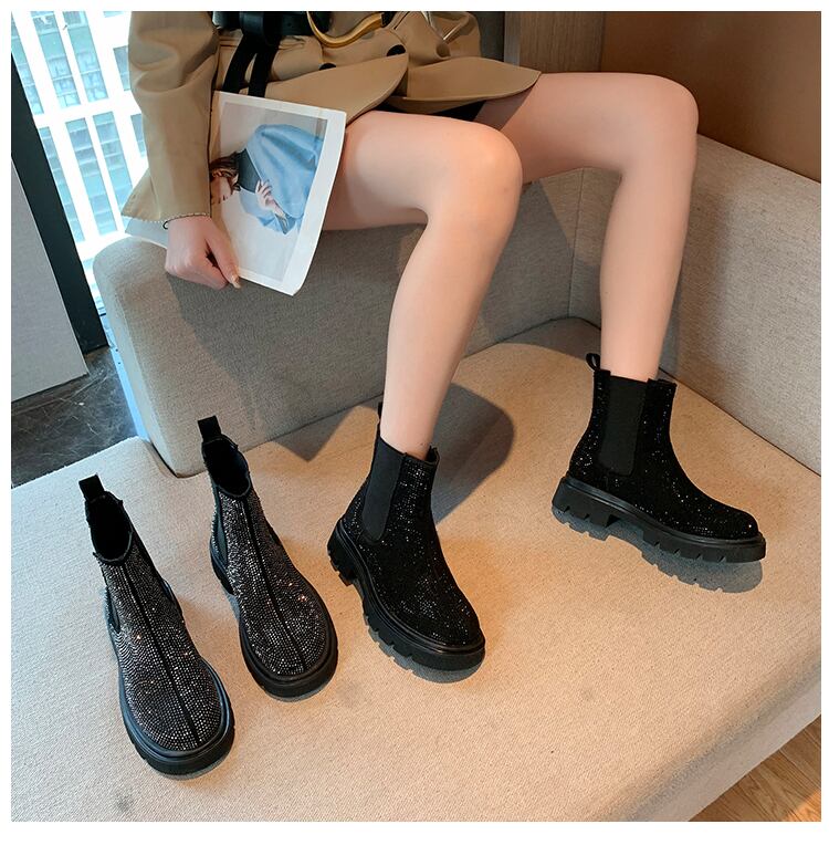 ブラックブーツスプリングオータムシングルラインストーンスタイルストレッチ 靴 シューズ エラスティック 伸縮 春物 秋物 部族の婦人靴14563100722