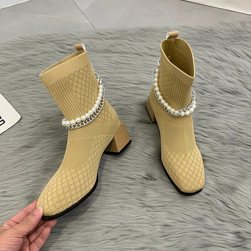 ストレッチブーツレディーススプリングオータムパールチェーン スタンダードショートソックス レトロ 靴 シューズ エラスティック 伸縮 春物 秋物 タイツ ストッキング 真珠 スクウェア 部族の婦人靴90163278696